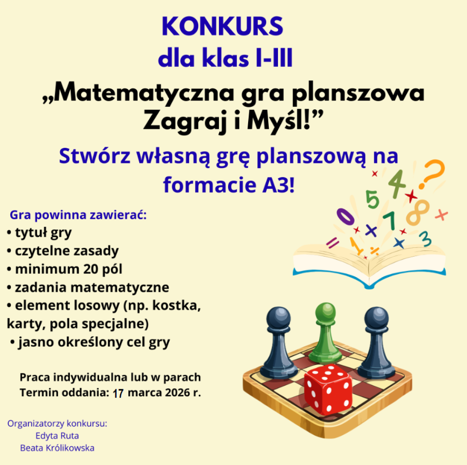Zadaniem uczestników jest zaprojektowanie i wykonanie własnej gry planszowej w formacie A3, zawierającej zadania matematyczne oraz jasno określone zasady gry. To doskonała okazja do rozwijania kreatywności, logicznego myślenia oraz matematycznych umiejętności poprzez zabawę. Serdecznie zachęcamy do udziału!